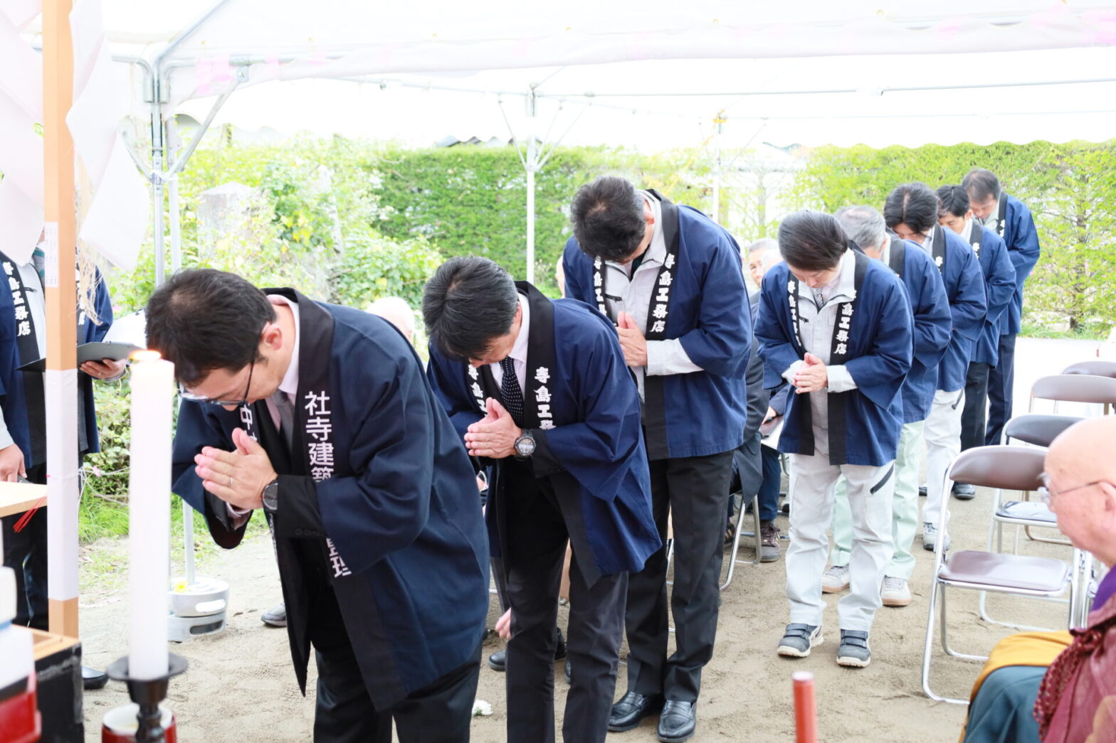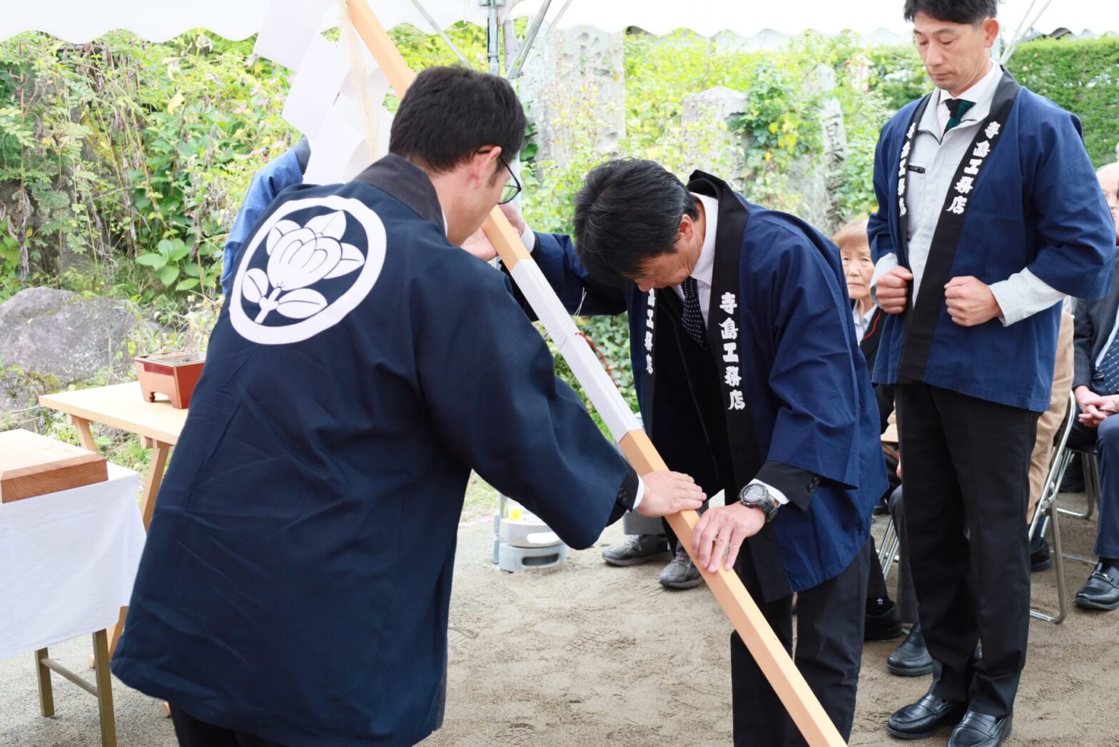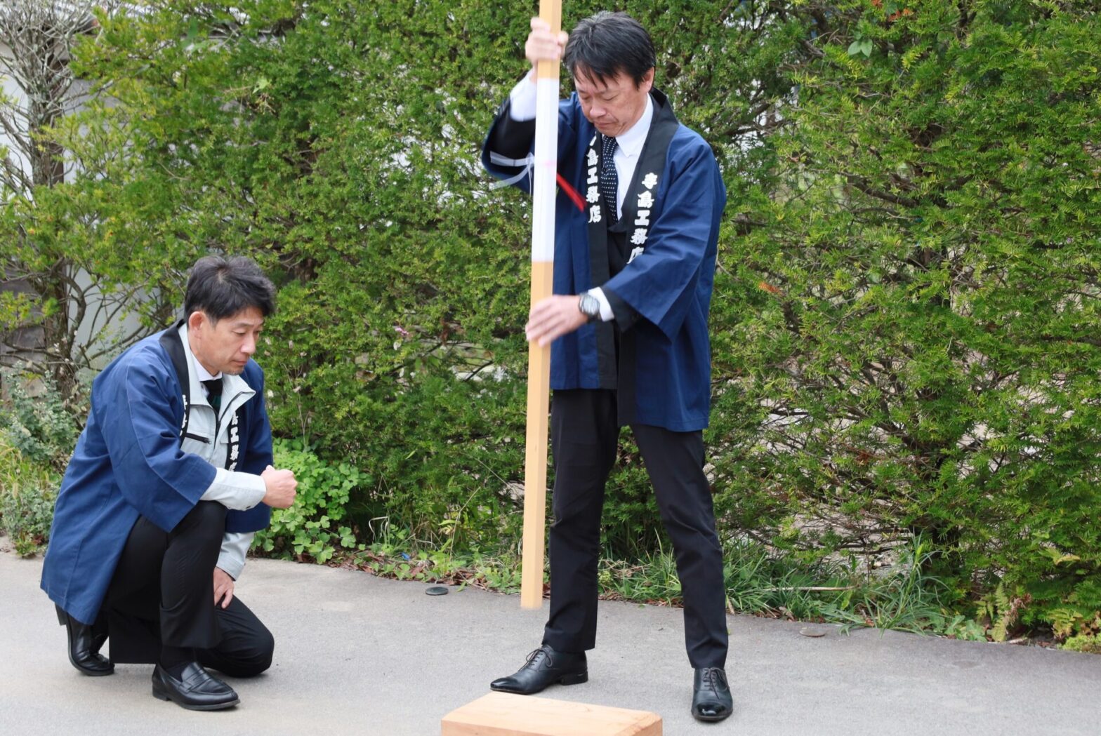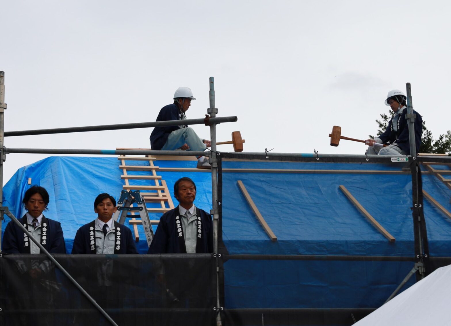 ❝振り幣役❞が千年も八千年も栄あれと祈願して「千歳棟(せんざいとう)」 万年も八百万年も栄あれと祈願して「万歳棟(まんざいとう)」 この世がある限り永久に栄える様に祈願して「永永棟(えいえいとう)」 との掛け声で幣を振り、これに応えるように❝槌打ち約❞が棟木打ち付けて堅固に収めます。
